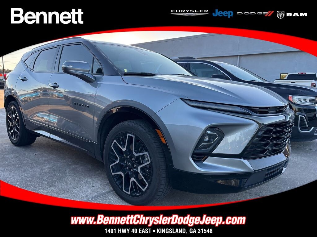 Bennett Chrysler Jeep Dodge Ram is pumped up to offer this great 2023 Chevrolet Blazer in Sterling Gray Metallic This vehicle has passed our comprehensive inspection and comes with the following Preferred Equipment Group 1RS (Heated Steering Wheel and Rear Park Assist w/Audible Warning), 3.49 Final Drive Axle Ratio, 4-Wheel Disc Brakes, 6-Way Power Front Passenger Seat Adjuster, 8 Speakers, 8-Way Power Driver Seat Adjuster, ABS brakes, Air Conditioning, Alloy wheels, AM/FM radio: SiriusXM with 360L, Apple CarPlay/Android Auto, Auto High-beam Headlights, Auto-dimming door mirrors, Auto-dimming Rear-View mirror, Automatic temperature control, Bose Premium 8-Speaker Audio System Feature, Brake assist, Bumpers: body-color, Child-Seat-Sensing Airbag, Compass, Delay-off headlights, Driver door bin, Driver vanity mirror, Dual front impact airbags, Dual front side impact airbags, Electronic Stability Control, Emergency communication system: OnStar and Chevrolet connected services capable, Four wheel independent suspension, Front anti-roll bar, Front Bucket Seats, Front Center Armrest, Front dual zone A/C, Front reading lights, Fully automatic headlights, Garage door transmitter, Heated door mirrors, Heated Driver & Front Passenger Seats, Heated front seats, Heated steering wheel, Illuminated entry, Knee airbag, Leather Shift Knob, Low tire pressure warning, Navigation System, Not Equipped w/Rear Park Assist, Occupant sensing airbag, Outside temperature display, Overhead airbag, Overhead console, Panic alarm, Passenger door bin, Passenger vanity mirror, Perforated Leather-Appointed Seat Trim, Power door mirrors, Power Driver Lumbar Control, Power driver seat, Power Liftgate, Power Panoramic Tilt-Sliding Sunroof, Power passenger seat, Power steering, Power windows, Premium audio system: Chevrolet Infotainment 3 Premium, Radio data system, Radio: Chevrolet Infotainment 3 Premium System, Rear anti-roll bar, Rear reading lights, Rear seat center armrest, Rear window defroster, Rear window wiper, Remote keyless entry, Ride & Handling Suspension, Security system, SiriusXM w/360L, Speed control, Speed-sensing steering, Split folding rear seat, Spoiler, Steering wheel mounted audio controls, Tachometer, Telescoping steering wheel, Tilt steering wheel, Traction control, Trip computer, Turn signal indicator mirrors, Variably intermittent wipers, Voltmeter, Wheels: 20" Technical Gray Aluminum, and Wheels: 21" High Gloss Black w/Machined Face;